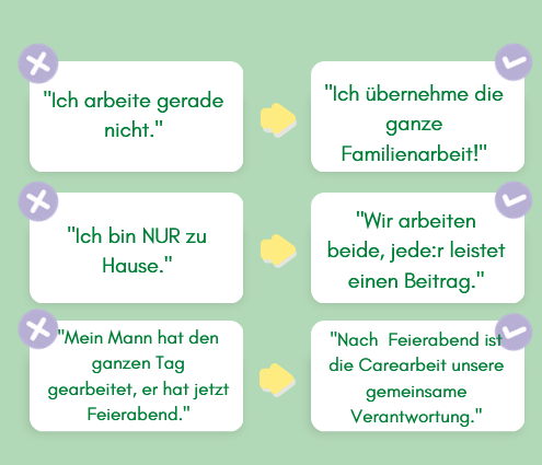 Ganz egal für welche Aufteilung ihr euch innerhalb eurer Beziehung entscheidet: Am Ende arbeitet ihr beide und ihr tragt beide dazu bei, dass der Laden läuft. Beide Arbeiten sind gleichwertig (auch wenn die Gesellschaft etwas anderes suggeriert, indem sie nur die Erwerbsarbeit honoriert). Der Elternteil, der die Carearbeit übernimmt, hält dem Elternteil, der die Erwerbsarbeit übernimmt, den Rücken frei und anders herum. Daher fangt bitte an, die Carearbeit mehr wertzuschätzen. Häufig werten wir sie nämlich selbst durch unsere Sprache ab.